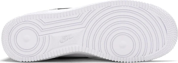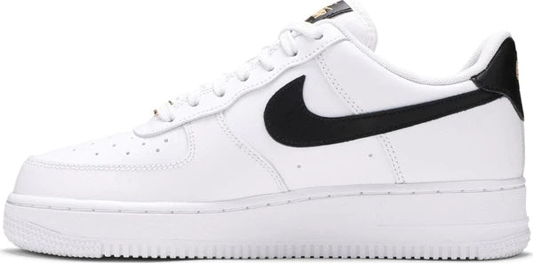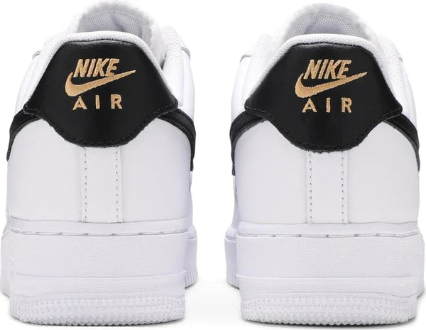 Esta oferta para o Nike Air Force 1 apresenta um couro branco emparelhado com Swooshes de couro preto, saltos, etiquetas de língua e palmilhas. Destaque para o calçado da marca Gold e dubraes de renda com solado em borracha maciça White AF1.