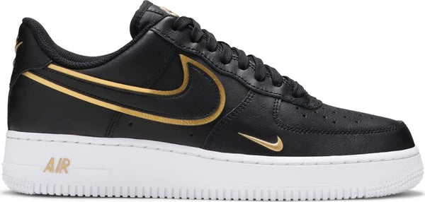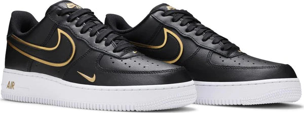 Esta oferta do Nike Air Force 1 Low apresenta uma parte superior de couro preto com Swooshes correspondentes nas laterais emparelhados com camadas de ouro metálico por baixo. O ouro continua no mini Swoosh do antepé bordado, na língua, nos calcanhares, na palmilha e na marca da entressola completada com uma sola sólida de borracha branca AF1.