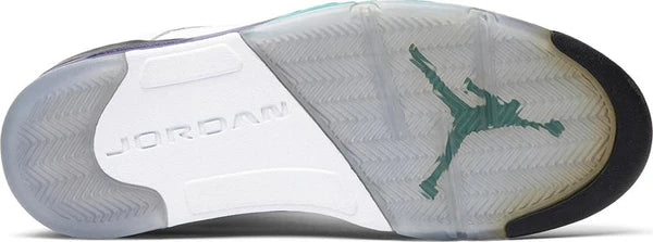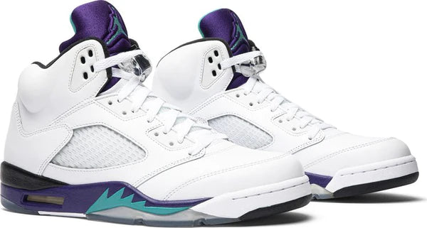 O Air Jordan 5 Retro 'Grape' voltou aos varejistas da Jordan Brand em maio de 2013. Um dos quatro colorways originais lançados em 1990, o tênis foi usado por MJ durante uma sessão de fotos da capa da caixa Wheaties e por Will Smith no Fresh Prince of Bel -Ar. Anteriormente retrô em 2006, o design combina uma parte superior de couro branco com detalhes em preto, nova esmeralda e uva em uma sola azul translúcida.