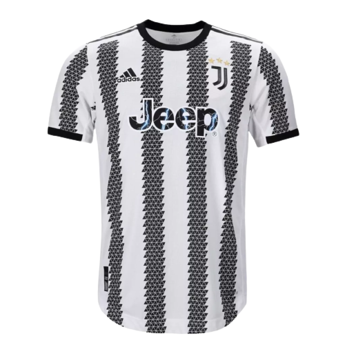 A nova camisa titular da Juventus traz as tradicionais listras verticais pretas sobre a base branca, no entanto, desta vez a Adidas inova mais uma vez, criando listras serrilhadas, que segundo a fornecedora, são formadas por triângulos “recodificados a estrela”, como um símbolo mágico, representando a magia do Allianz Stadium.