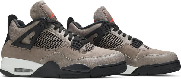 O Air Jordan 4 Retro 'Taupe Haze' apresenta uma colorway discreta do design de 1989 de Tinker Hatfield. Um acabamento taupe escuro é aplicado na parte superior, construído a partir de uma mistura de camurça texturizada com couro rachado na gola, língua e guarda-lamas. Golpes pretos contrastantes pousam nos cadarços, asas de plástico e aba do calcanhar, este último marcado com um logotipo Jumpman em relevo. Um segundo ícone do Jumpman é renderizado em infravermelho na etiqueta da língua, combinando com o revestimento interno da língua. O amortecimento leve é fornecido por uma entressola de PU de dois tons, abrigando uma unidade Air visível no calcanhar e Air encapsulado no antepé.