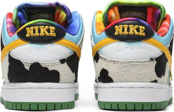 Feito em colaboração com a Ben & Jerry's, o Nike Dunk Low SB 'Chunky Dunky' replica a embalagem usada para o sabor Chunky Monkey da marca de sorvete. A parte superior de couro retrata céus azuis e pastagens verdes, enquanto as sobreposições de cabelo de pônei são renderizadas em uma estampa de vaca manchada. Um Swoosh de couro amarelo é tratado com um efeito de sorvete derretido para um toque visual adicional. No topo da língua, a etiqueta tecida apresenta uma chamada Chunky Dunky ao lado da marca Nike SB.